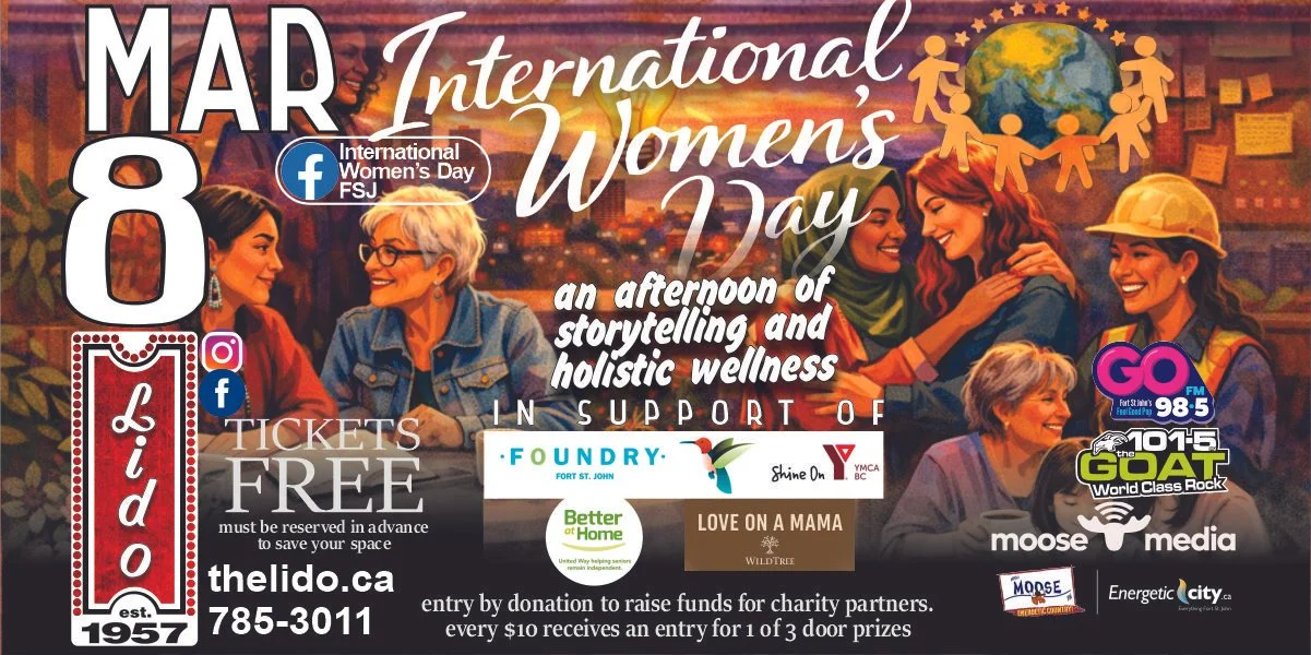 Back to All Events International Women's Day Sunday, March 8, 2026 1:00 p.m. 5:00 p.m. Lido Theatre 10156 100 Avenue Fort St. John, BC, V1J 1Y6 Canada (map) Google Calendar ICS Save Your Spot Here