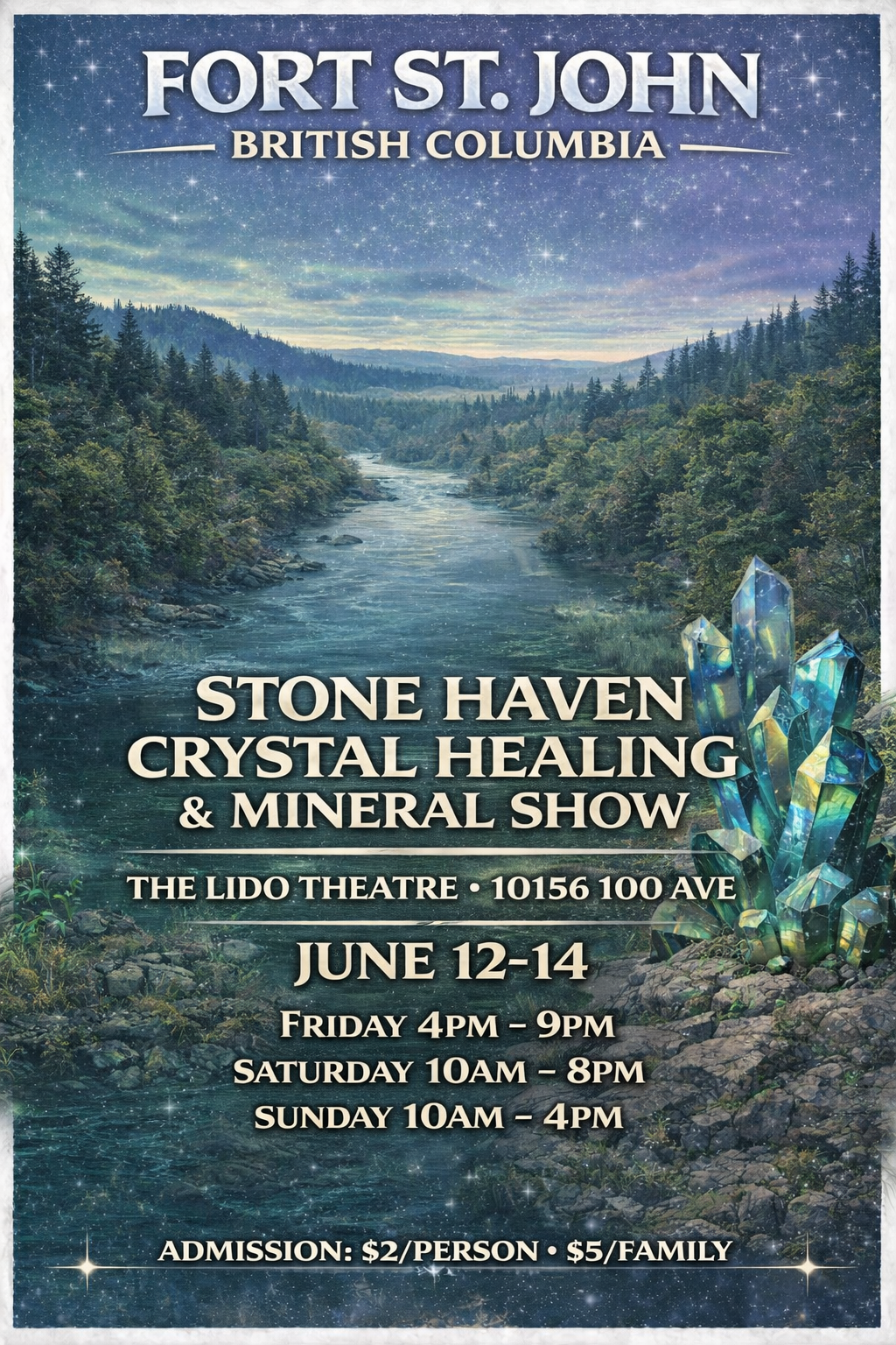 Stone Haven Crystal Healing & Mineral Trade Show Friday, June 12, 2026 4:00 p.m. 9:00 p.m. Lido Theatre 10156 100 Avenue Fort St. John, BC, V1J 1Y6 Canada (map) Google Calendar ICS $2 per/person or $5 Family at door